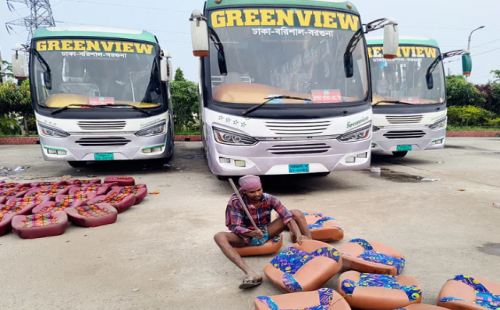 অবরোধের কারণে বরগুনা বাস টার্মিনাল থেকে ঢাকাসহ দূরপাল্লার বাস ছেড়ে যায়নি। এই অবসরে বাসের আসনগুলো ধোয়া–মোছার কাজ সেরে নেন এক শ্রমিক