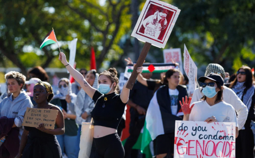 ক্যালিফোর্নিয়ার সান দিয়েগোতে নর্থরপ গ্রুম্যানের কারখানার বাইরে বিক্ষোভকারীরা।